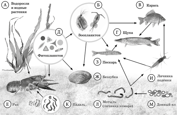 Изучите фрагмент экосистемы пресного водоёма, представленный на рисунке, и выполните задания 19-21.