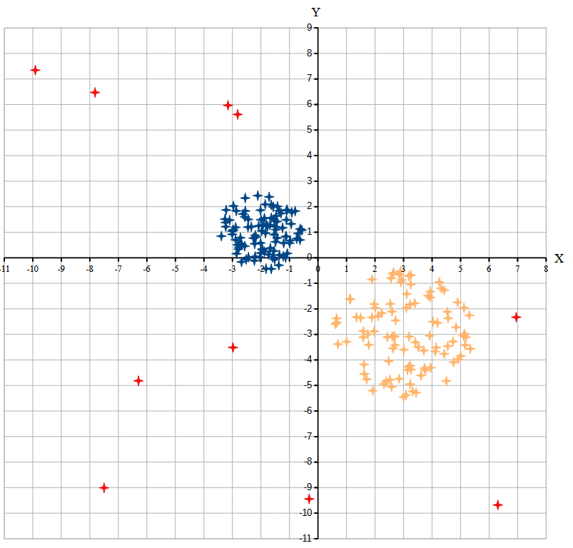 Аномалиями назовём точки, находящиеся на расстоянии более одной условной единицы от точек кластеров. При расчётах аномалии учитывать не нужно.