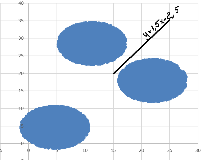 Из графика видно, что один кластер имеет абсциссы, меньшие 15, другой – все остальные. Пользуясь этим знанием, разделим данные на кластеры в программе.