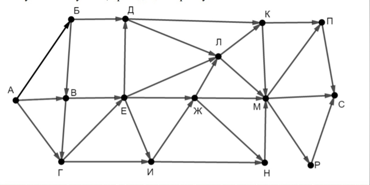 На рисунке представлена схема дорог, связывающих пункты А, Б, В, Г, Д, Е, Ж, И, К, Л, М, Н, П, Р, С. По каждой дороге можно передвигаться только в направлении, указанном стрелкой. Какова длина (в дорогах) максимального пути из пункта А в пункт С, проходящих через пункт Ж?