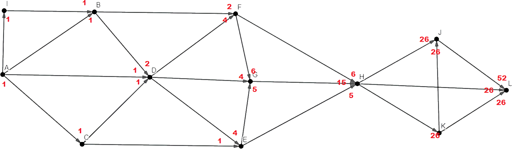 Красным отмечено, сколько путей идёт в конкретную вершину по конкретной стрелке. Заметим, что если в город идёт более, чем одна дорога, значит количество путей в этот город будет равно сумме количеств путей, ведущих в города, из которых эти дороги начинаются. В этом и есть принцип динамического решения. Получается, если сложить все красные числа, нарисованные около конкретного города, как раз можно получить количество различных путей, ведущих в этот город.