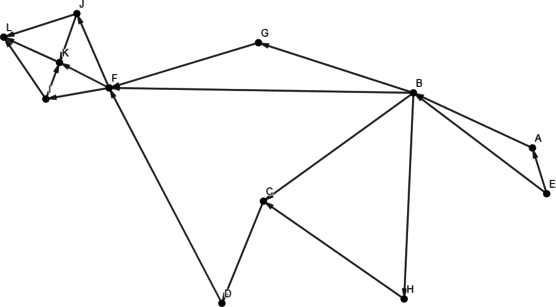 На рисунке представлена схема дорог, связывающих города E, A, B, C, D, F, G, H, K, J, I, L. По каждой дороге можно двигаться только в одном направлении, указанном стрелкой.