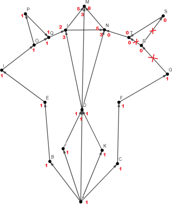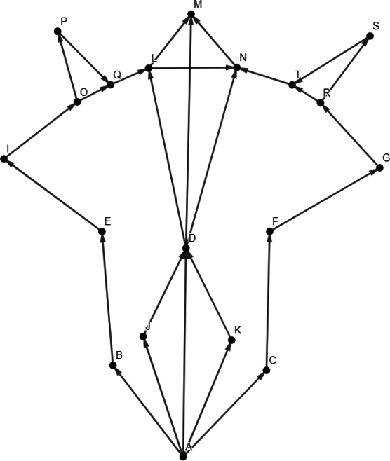 На рисунке представлена схема дорог, связывающих города A, K, J, B, C, D, E, F, G, R, S, T, N, I, O, P, Q, L, M. По каждой дороге можно двигаться только в одном направлении, указанном стрелкой.