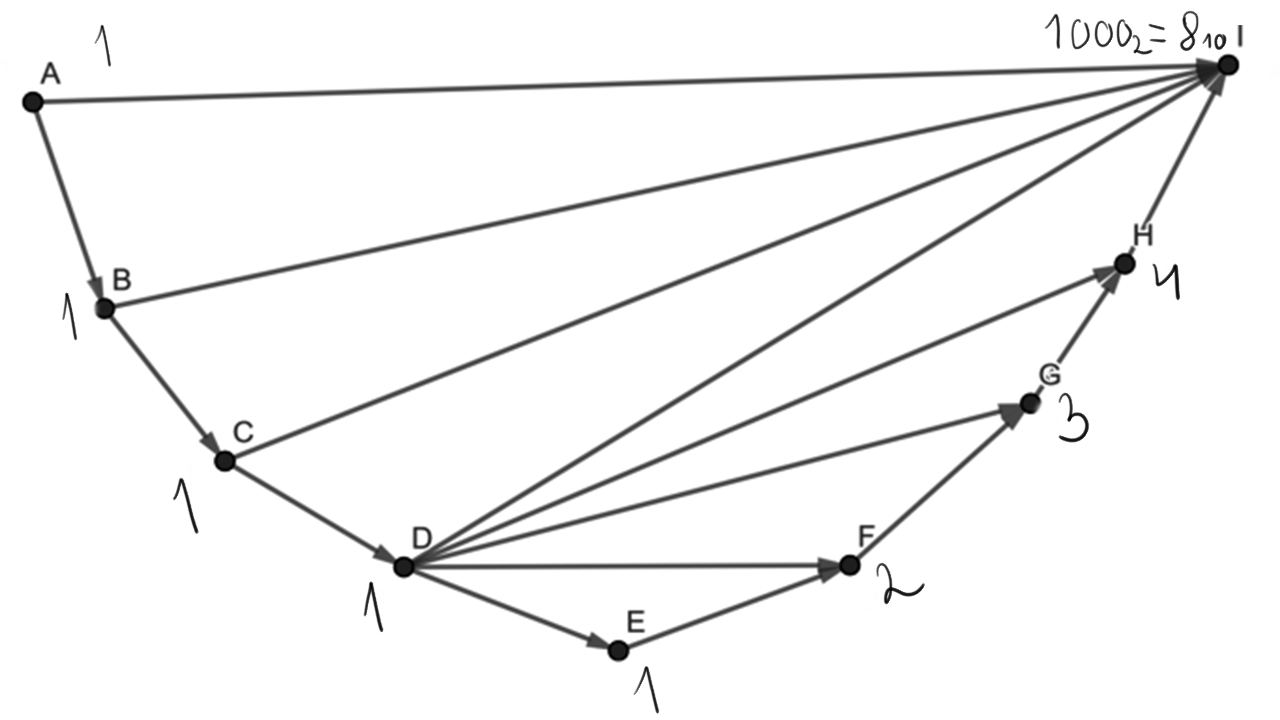 На рисунке представлена схема путей в комнаты смешариков в их доме. К смешарикам в гости приехала погостить Юлия и остановилась в комнате А, смешарик МС живет в комнате I. Найдите сколькими путями Юлия может добраться до смешарика МС, если передвигаться между комнатами можно только в направлении, указанном стрелкой. Ответ запишите в системе счисления с основанием 2.