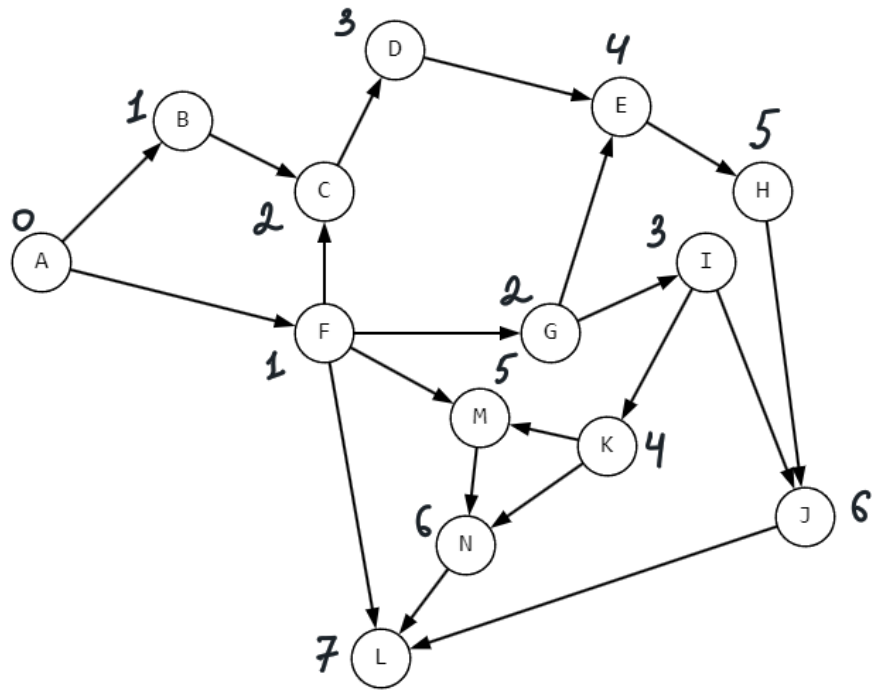 На рисунке представлена схема дорог, связывающих города A, B, C, D, E, F, G, H, I, J, K, M, N, L. По каждой дороге можно двигаться только в одном направлении, указанном стрелкой.