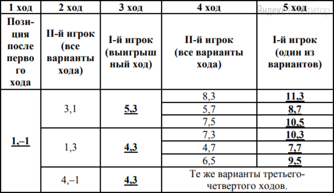 Выигрывает первый игрок, своим первым ходом он должен поставить фишку в точке с координатами (1; -1). Для доказательства рассмотрим неполное дерево игры, оформленное в виде таблицы, где в каждой ячейке координаты фишки на каждом этапе игры.