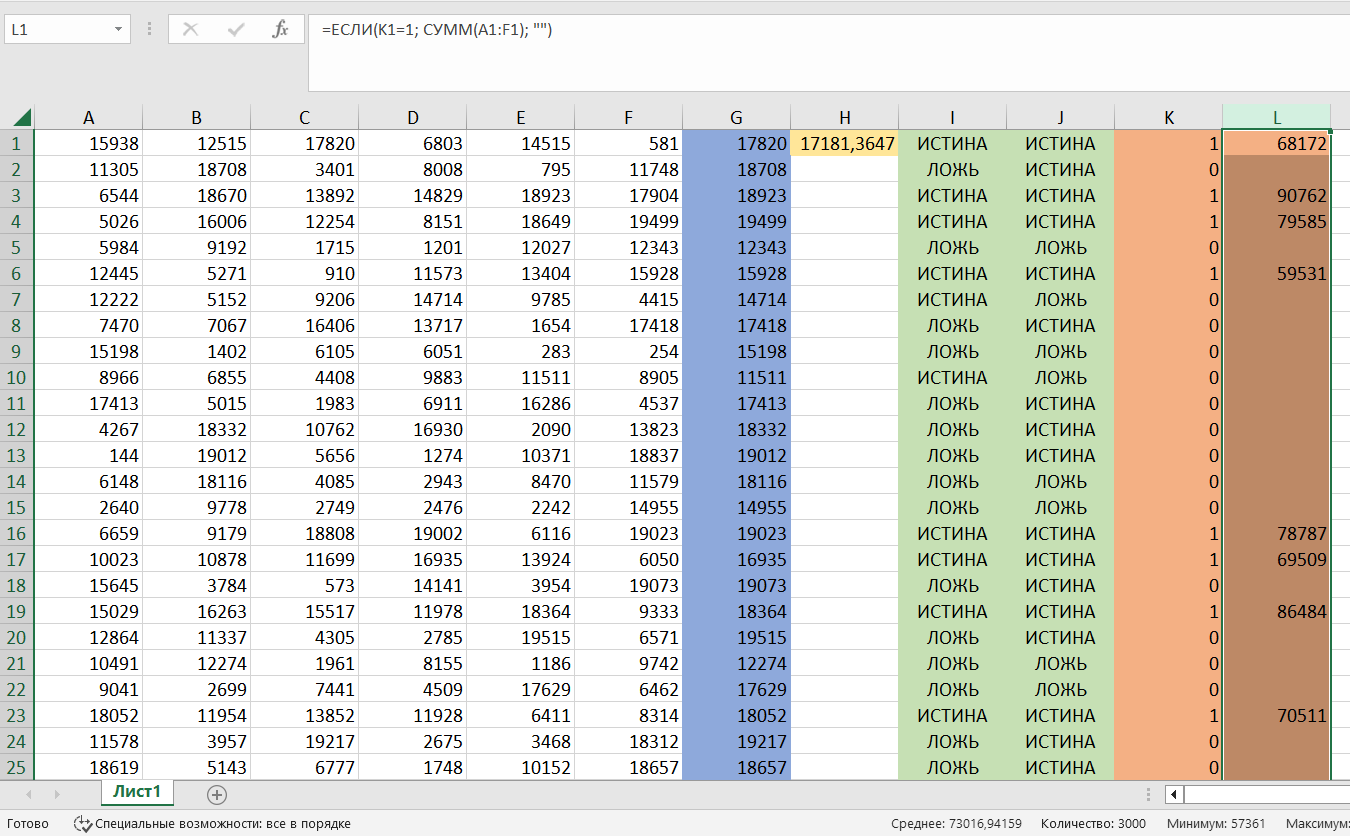 При выполнении всех условий рядом со строкой должна выводиться единица. Выделяем весь столбец и на нижней панели смотрим сумму — это количество подходящих строк. В соседнем столбце выводим суммы чисел из строк, если строка нам подходит, в противном случае оставляем пустую строку. Минимальную сумму можно подсмотреть на нижней панели, выделив столбец. Если у вас ничего не отображается, то вам нужно кликнуть правой кнопкой мыши по панели и галочкой отметить все нужные параметры.