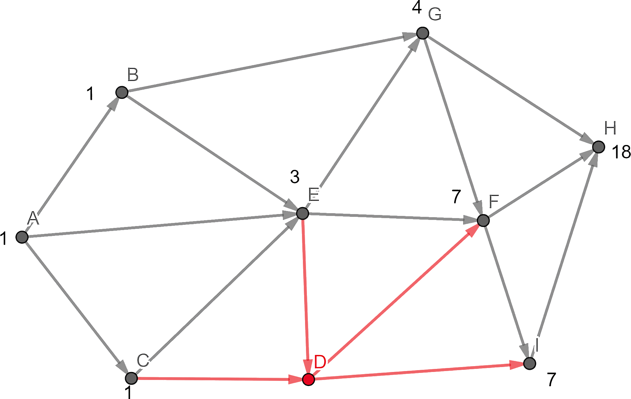 На рисунке представлена схема дорог города Клонов АР. Сколько существует дорог из пункта А в пункт H, не проходящих через пункт D?
