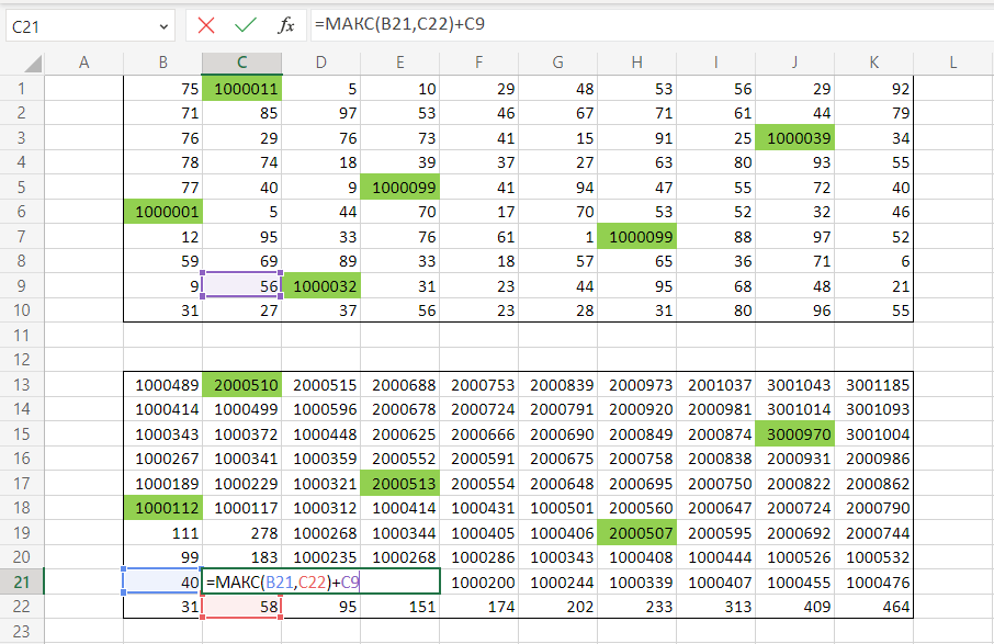 Вставляем эту формулу во все оствшиеся клетки таблицы. Не забываем, что мы специально добавили несколько миллионов. Так как Робот посетил зеленые клетки, то запишем в свободную ячейку формулу =К13-3000000, полученное число и есть ответ.