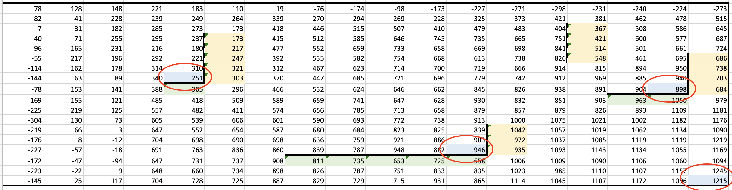 Выделяем желтым цветом диапазон ячеек, которые стоят справа от стены и зеленым цветом, которые стоят под стеной. В желтые ячейки можно прийти только из ячеек, находящихся сверху, поэтому модернизуем формулу. В желтые ячейки необходимо написать формулу, аналогичиную формуле для первого столбца, то есть исходная ячейка + предыдущая сверху. В зеленые ячейки можно прийти только из ячеек, находящихся слева, поэтому модернизуем формулу. В зеленые ячейки необходимо написать формулу, аналогичиную формуле для первой строки, то есть исходная ячейка + предыдущая слева.
