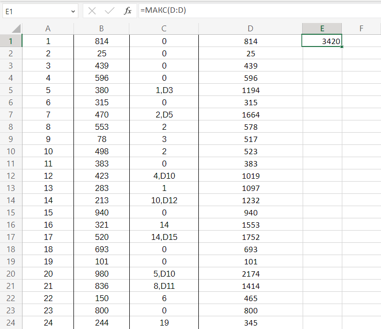 В ячейку записываем формулу «=МАКС(D:D)» и получаем ответ: 3420.