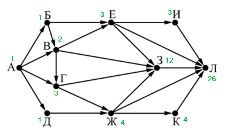 На рисунке – схема дорог, связывающих города А, Б, В, Г, Д, Е, Ж, З, И, К и Л. По каждой дороге можно двигаться только в одном направлении, указанном стрелкой. Сколько существует различных путей из города А в город Л?
