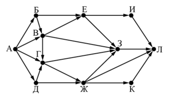 На рисунке – схема дорог, связывающих города А, Б, В, Г, Д, Е, Ж, З, И, К и Л. По каждой дороге можно двигаться только в одном направлении, указанном стрелкой. Сколько существует различных путей из города А в город Л?