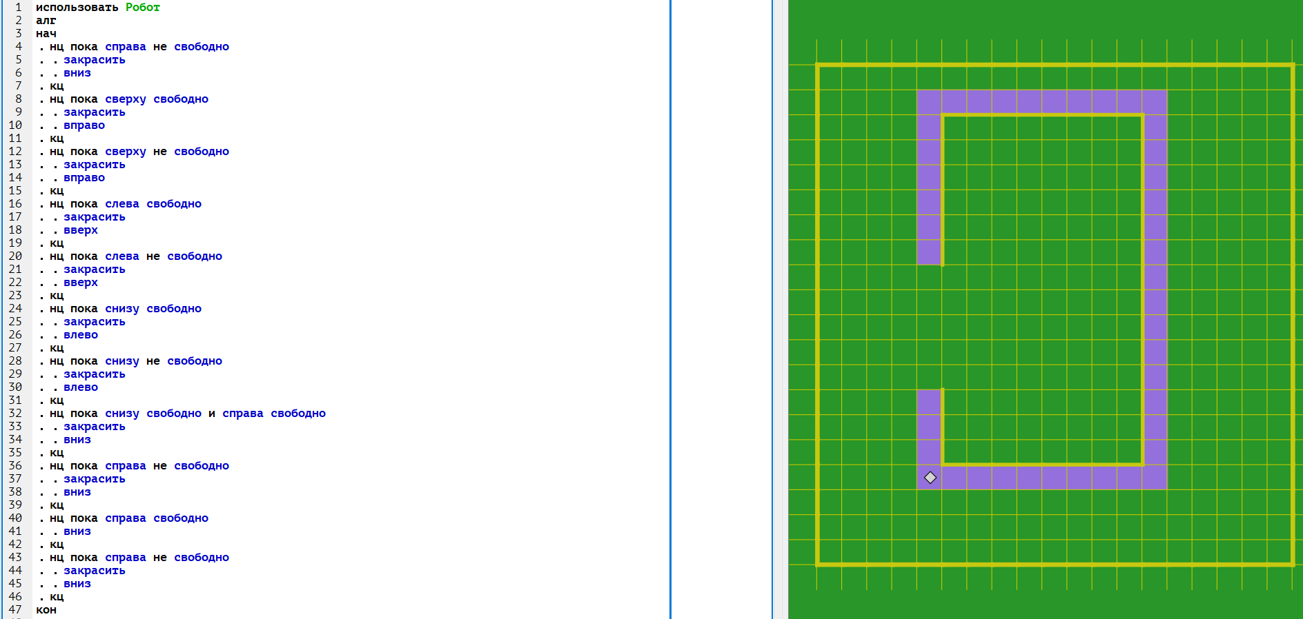 Напишите для Робота алгоритм, закрашивающий все клетки, расположенные вдоль стен прямоугольника с внешней стороны и угловые клетки. Проход должен остаться незакрашенным. Робот должен закрасить только клетки, удовлетворяющие данному условию. Например, для приведённого выше рисунка Робот должен закрасить следующие клетки (см. рисунок).