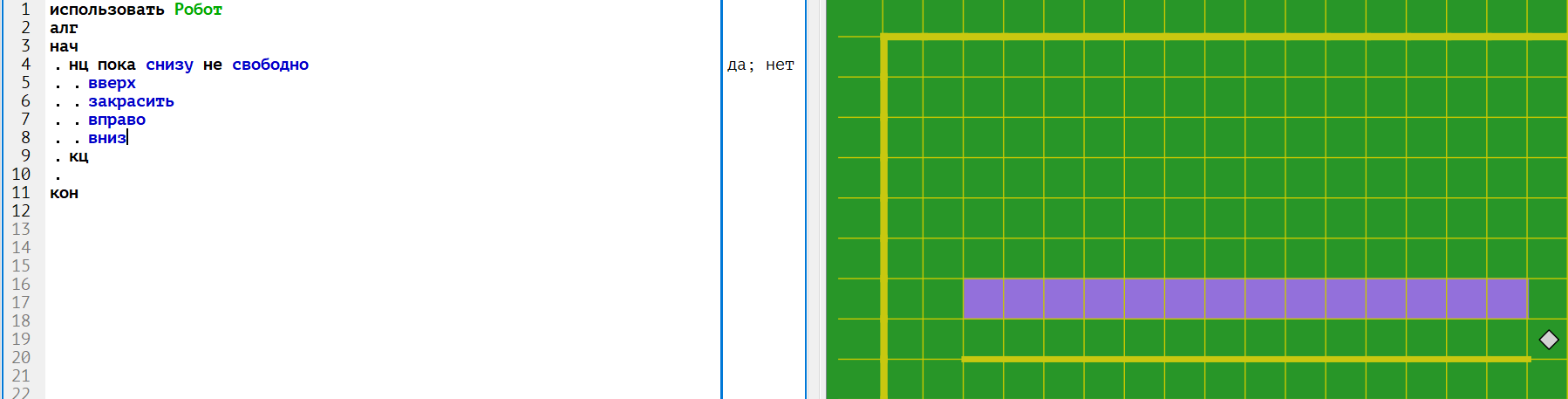 Напишите алгоритм для Робота, закрашивающий все клетки, расположенные выше стены на расстоянии одной пустой клетки от стены, независимо от длины стены. Робот должен закрасить только клетки, удовлетворяющие заданному условию. Например, для приведённого выше рисунка Робот должен закрасить следующие клетки: