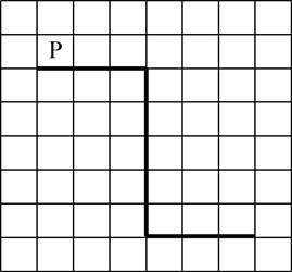 На бесконечном поле имеется стена. Стена состоит из трёх последовательных отрезков: вправо, вниз, вправо, все отрезки неизвестной длины. Робот находится в клетке, расположенной над левым концом первого отрезка. На рисунке указан один из возможных способов расположения стен и Робота (Робот обозначен буквой «Р»).