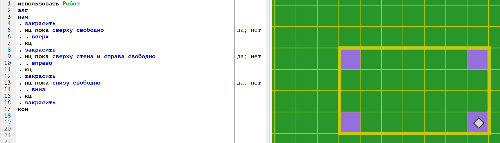 Напишите для Робота алгоритм, закрашивающий четыре угловые клетки прямоугольника. Робот должен закрасить только угловые клетки. Например, для приведённого выше рисунка Робот должен закрасить следующие клетки (см. рисунок):
