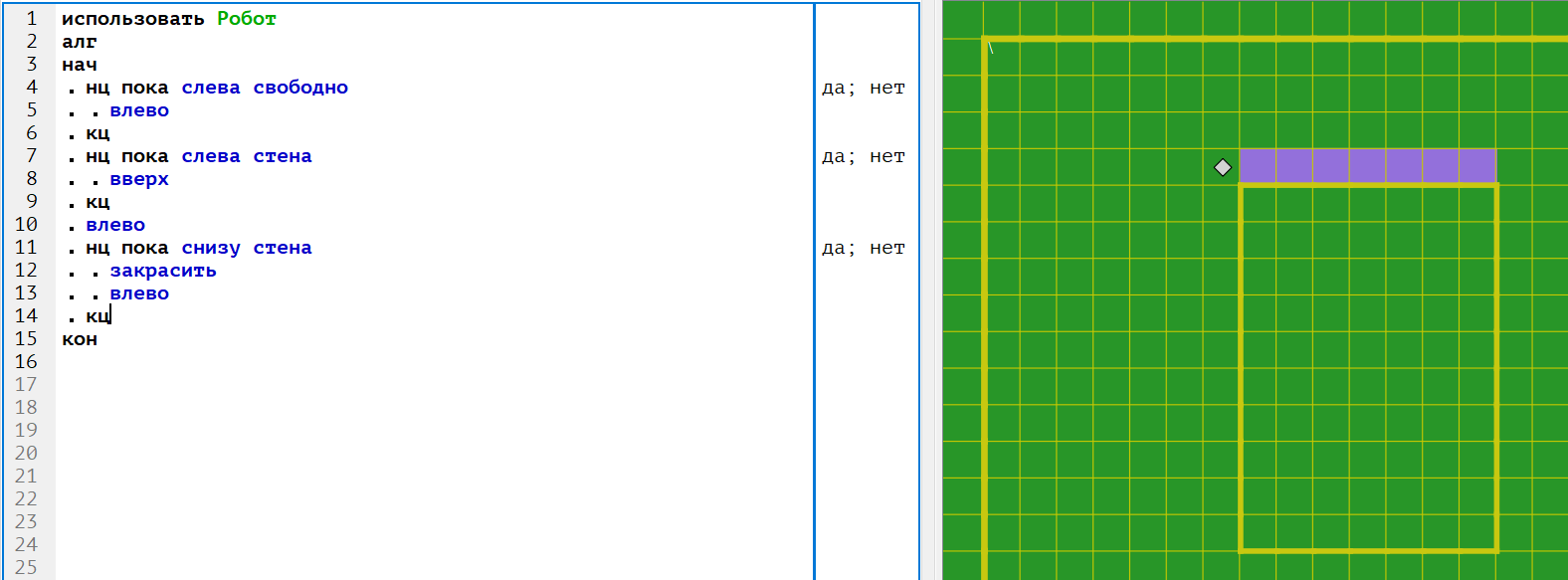 Также у Робота есть команда закрасить, при которой закрашивается клетка, в которой Робот находится в настоящий момент.