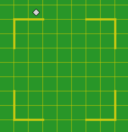 На бесконечном поле имеются четыре стены, соединённые между собой, которые образуют прямоугольник. Длины стен неизвестны. В каждой стене есть ровно один проход. Проход не может примыкать к углу прямоугольника. Точное место прохода и ширина прохода неизвестна. Робот находится около левого конца верхней горизонтальной стены, снаружи прямоугольника.