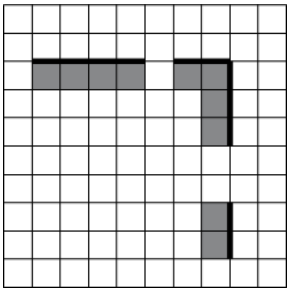Напишите для Робота алгоритм, закрашивающий все клетки, расположенные непосредственно ниже горизонтальной стены и левее вертикальной стены. Проходы должны остаться незакрашенными. Робот должен закрасить только клетки, удовлетворяющие данному условию. Например, для приведённого выше рисунка Робот должен закрасить следующие клетки (см. рисунок).