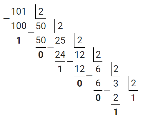 Для того, чтобы перевести число 101 из десятичной системы счисления в двоичную, необходимо осуществить последовательное деление на 2, то тех пор пока остаток не будет меньше чем 2.