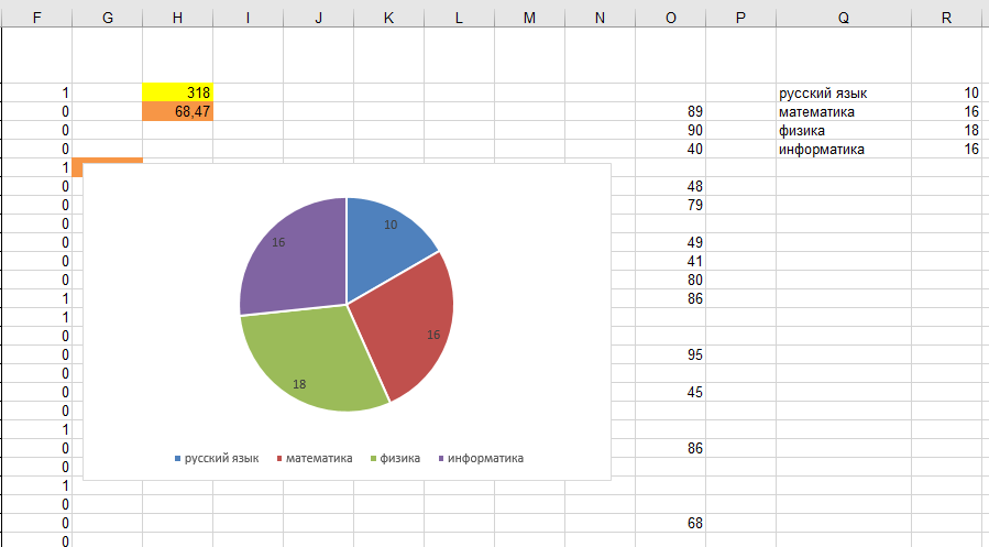 3. Постройте круговую диаграмму, отображающую соотношение числа участников, набравших 95 баллов по русскому языку, математике, физике и информатике. Левый верхний угол диаграммы разместите вблизи ячейки G6. В поле диаграммы должны присутствовать легенда (обозначение, какой сектор диаграммы соответствует каким данным) и числовые значения данных, по которым построена диаграмма.
