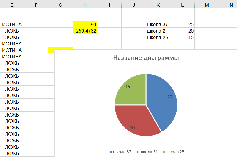3. Постройте круговую диаграмму, отображающую соотношение числа участников из школ № 37, 21 и 25. Левый верхний угол диаграммы разместите вблизи ячейки G6. В поле диаграммы должны присутствовать легенда (обозначение, какой сектор диаграммы соответствует каким данным) и числовые значения данных, по которым построена диаграмма.
