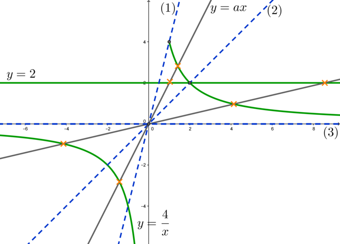 Из рисунка видно, что три общие точки будут тогда, когда прямая находится между положениями (1) и (3), не включая их и положение (2). На рисунке положения (1), (2), (3) отмечены синим пунктиром, примеры подходящего положения прямой