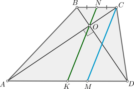 . По свойству трапеции этот отрезок проходит через точку пересечения диагоналей. Тогда
