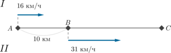 Из пункта А в пункт С выехал мотоциклист, скорость которого 16 км/ч. Одновременно с ним из пункта В, находящегося между пунктами А и С, в пункт С выехал второй мотоциклист, скорость которого 31 км/ч. Расстояние между пунктами A и B равно 10 км. Через сколько минут расстояние между мотоциклистами будет равно 17,5 км? Если задача допускает несколько вариантов ответа, в бланке укажите их сумму.