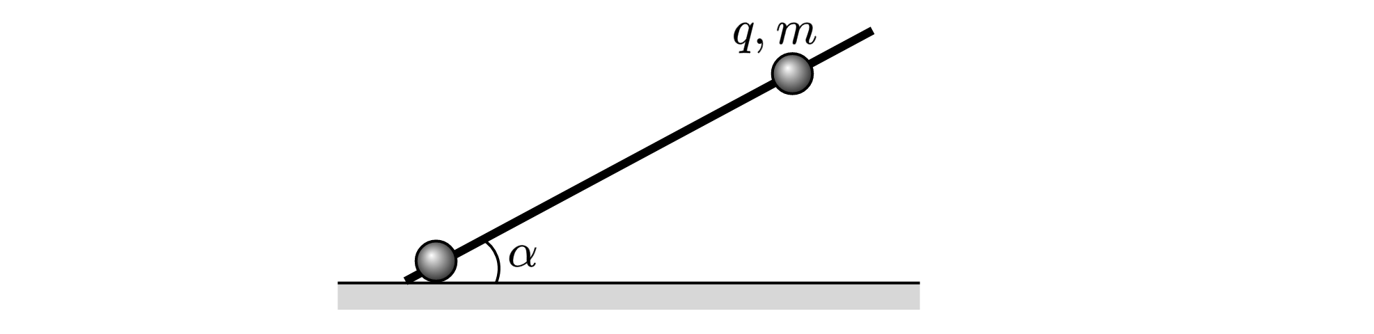 В стол воткнута нижним заостренным концом спица, наклоненная под углом к горизонту. У ее нижнего конца закреплена маленькая заряженная бусинка. На спицу надета другая такая же заряженная бусинка, которая может скользить по спице без трения. Заряды бусинок одинаковы и равны