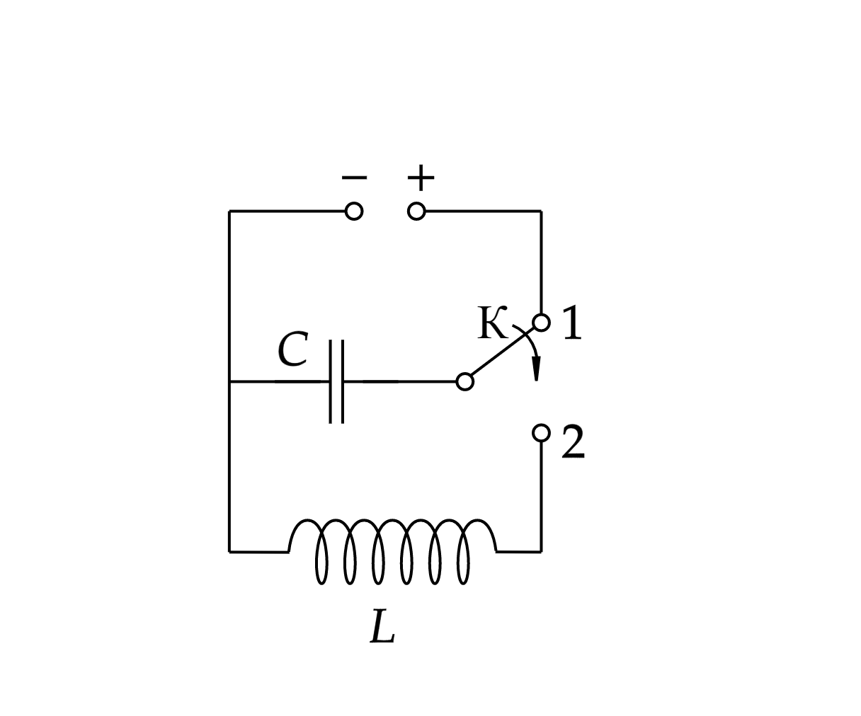 Конденсатор идеального колебательного контура длительное время подключён к источнику постоянного напряжения (см. рисунок). В момент переключатель К переводят из положения 1 в положение 2. Графики А и Б отображают изменения физических величин, характеризующих возникшие после этого электромагнитные колебания в контуре (T – период колебаний).