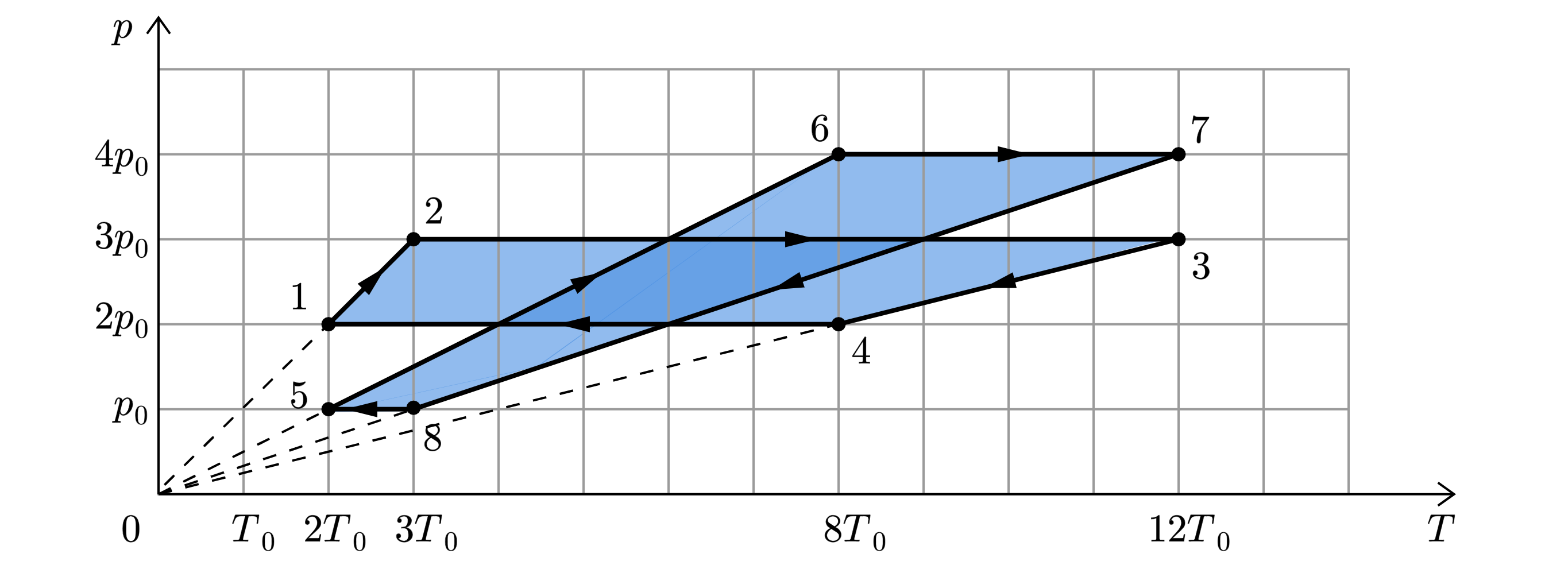 На рисунке показаны pT-диаграммы двух циклических процессов, совершаемых с одним и тем же постоянным количеством идеального газа. Некоторая тепловая машина сначала осуществляет цикл 1-2-3-4-1, а затем — цикл 5-6-7-8-5.